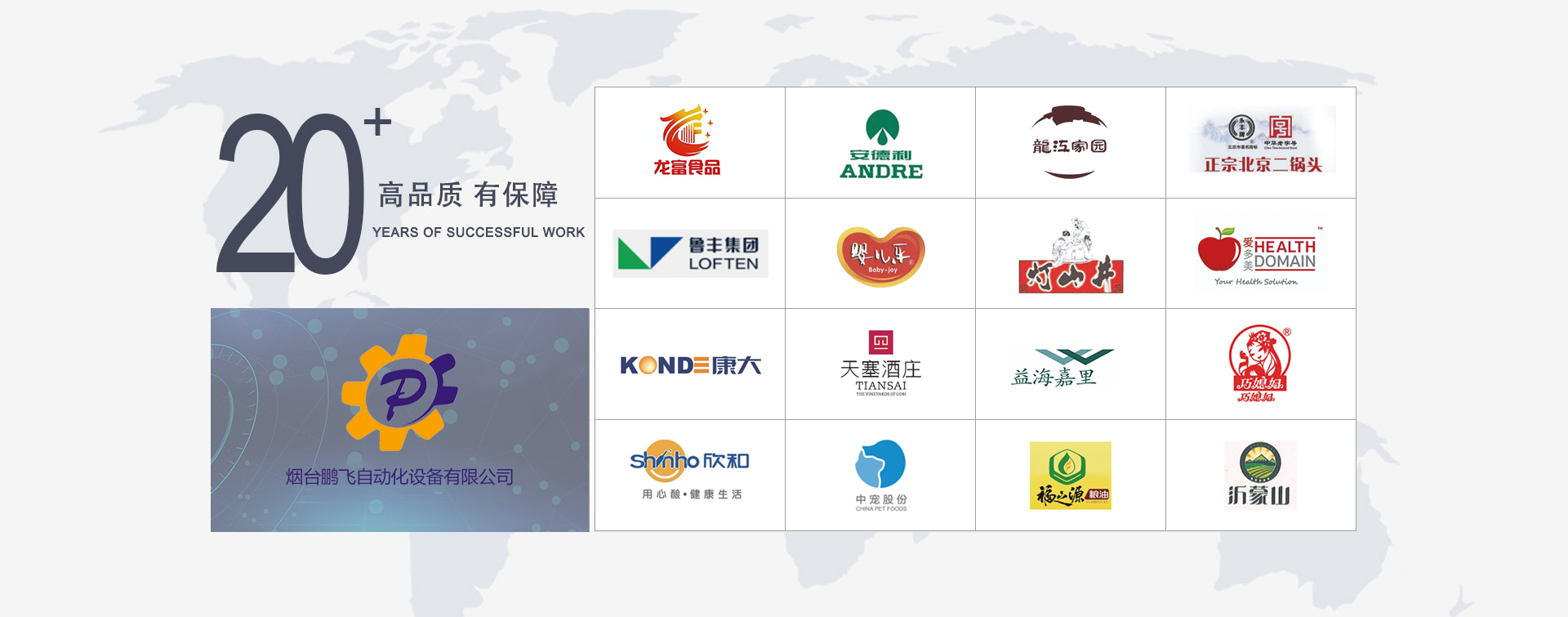 煙臺鵬飛自動化設備有限公司 坐落于美麗的海濱城市--煙臺,是一家專注于中低速貼標機、食用油灌裝生產線等設備的研發、設計、生產、銷售、售后服務于一體的設備制造商。長期以來,建立了一套完整的服務體系,公司擁有先進的生產技術,精湛的生產工藝,嚴格的質量管理形成了強大的競爭優勢,其產品暢銷全國十幾個省、市、自治區,并遠銷中亞五國埃及、緬甸、新加坡、智利等國家。